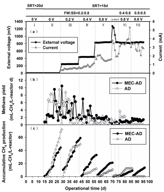 Fig. 1. Applied external voltage and current of MEC-AD (a), variations in methane production rate (b), accumulative methane yield (c) at different stages in two systems.