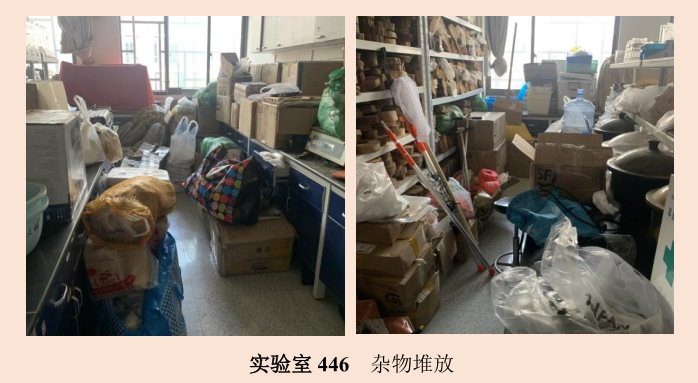 因此,实验室安全小卫士们于10月25日-28日分4个小分队,在资环楼进行了本学期第二轮实验室实验室、办公室安全专项检查。此次依旧重点检查了实验室管理规范、设备安全、废弃物处置、卫生,检查结果如下。对于检查中发现的安全隐患、卫生问题,小卫士进行了拍照记录与整理。