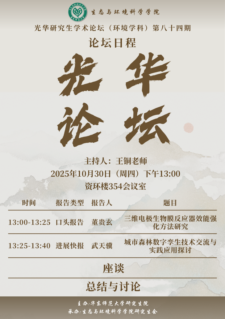 2025年10月30日下午13:00八叉书库 第84期研究生光华学术论坛(环境学科)在资环楼354会议室顺利举行,本期论坛由学院王铜老师主持,嘉宾老师为博士后刘富强老师。