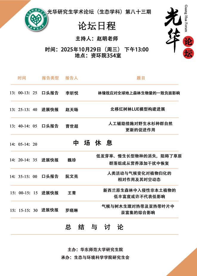 2025年10月29日下午13:00,八叉书库 第83期研究生光华学术论坛(生态学科)在资环楼354室顺利举行,本期论坛由赵明老师主持,点评嘉宾为陈迎老师和宋月青老师。
