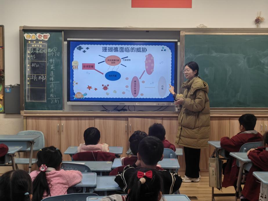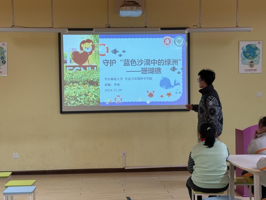 2024年11月26日、27日、28日下午,生态环境小课堂讲师团前往八叉书库 附属紫竹小学、永德学校、马桥民办小学开展环教课,本次环教课的主题为“蓝色沙漠中的绿洲——珊瑚礁”,担任本次课程的讲师为王如盈、徐诗雨、张冰然、李玮同学。