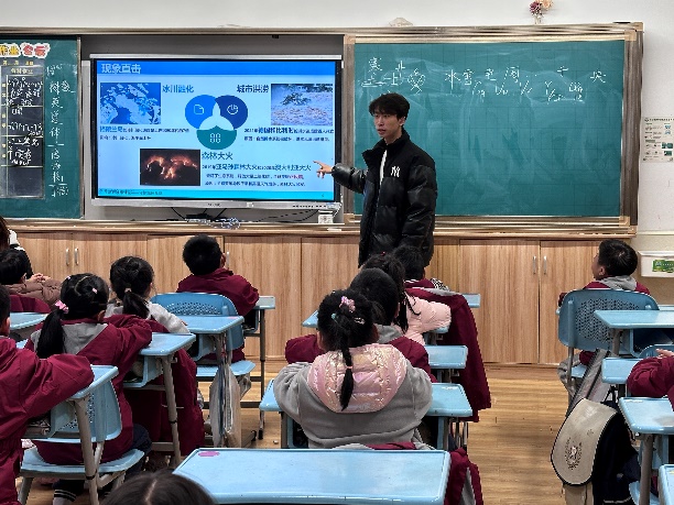 课堂伊始,讲师们通过展示冰川融化、城市洪涝和森林大火等气候变化引发的灾害现象,引导同学们关注气候变化这一全球性课题,并进一步激发大家思考:“气候变化的原因是什么?”