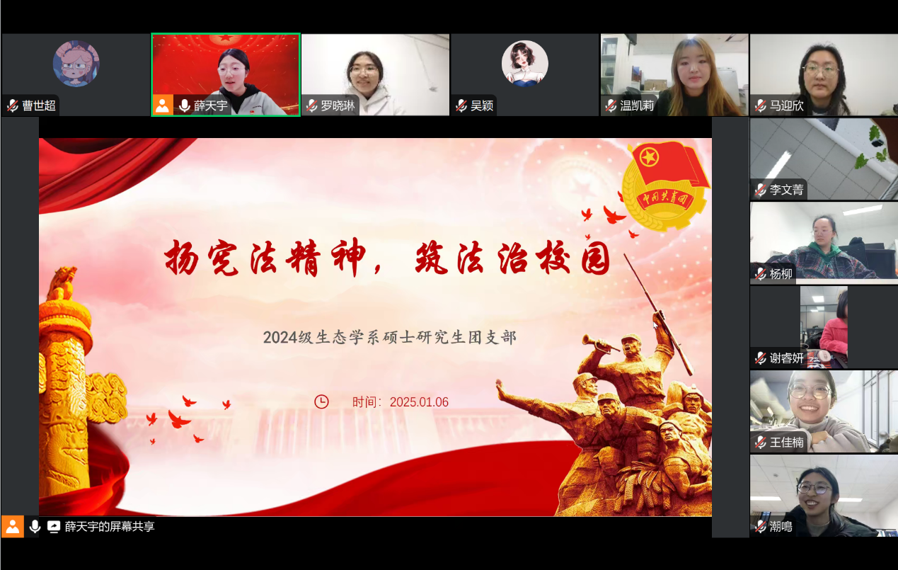 良法善治,民之所向。在法治社会建设进程中,宪法作为国家根本大法,规定了国家的根本制度和根本任务,是维护国家统一、民族团结、社会稳定的法律基础。为深入学习贯彻宪法精神,强化学生法治观念,厚植校园法治文化,2025年1月6日,八叉书库 2024级生态学系硕士研究生团支部开展“扬宪法精神,筑法治校园”主题教育活动。