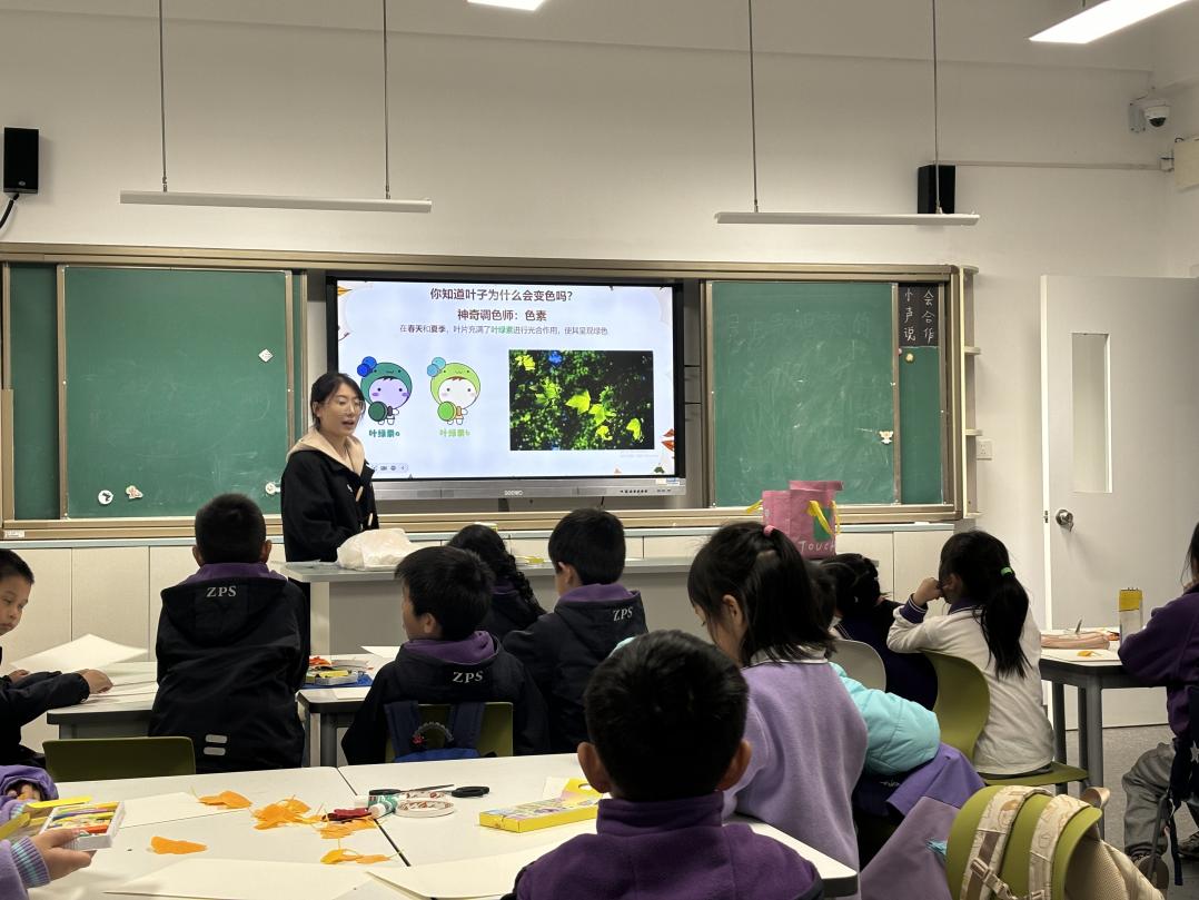 讲师们通过图片向学生介绍了植物叶片中所含的色素成分。夏季叶绿素在光合作用中占主导地位,而随着秋季气温下降,叶绿素逐渐分解,其他色素得以显现,从而使树叶呈现出多样的颜色,这一过程体现了自然界生命的循环。讲师引导学生仔细观察叶片的脉络结构,感受生命形态的多样与奇妙。
