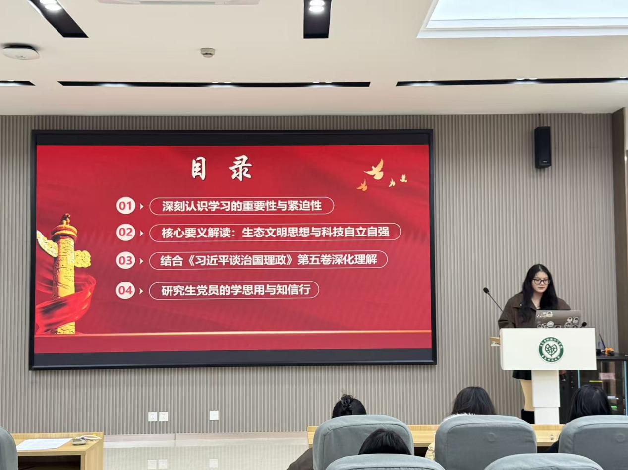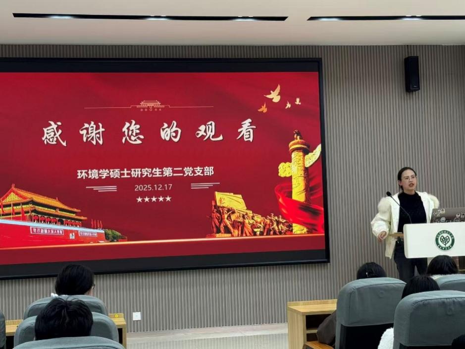 为把学习贯彻习近平新时代中国特色社会主义思想、习近平总书记最新重要讲话精神同组织学习《习近平谈治国理政》第五卷结合起来,坚持读原著、学原文、悟原理,切实做到学思用贯通、知信行统一,生环学院环境学硕士研究生第二党支部于2025年12月17日下午组织开展了以“深学细悟笃行 筑牢思想根基”为主题的党日活动。活动围绕组织学习《习近平谈治国理政》第五卷重要内容展开。活动由支部书记徐寒雨主持,支部指导老师顾佳艳参加此次活动。