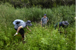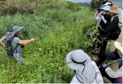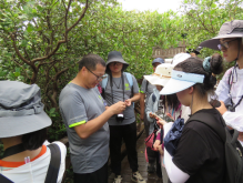 19日一早,师生们首先对漳江口红树林植被的整体分布状况进行了踏查,并初步调研了红树植物的生长、生态适应特征。虽然红树林里的植物种类比较简单,但是红树林周边的海堤上草木茂盛,长满了形形色色的草本植物。在踏查中,同学们发现了许多从未见过的植物,如苦郎树、红毛草、小刀豆等,也认出了一些入侵植物,如白花鬼针草。同学们一边听着讲解,一边采集标本,渐渐地对当地植物的情况有了初步的认识。另外,也理解了鱼塘开挖等人类干扰活动所导致的外来入侵植物对红树林构成的威胁。