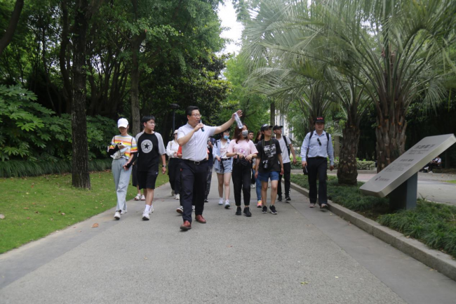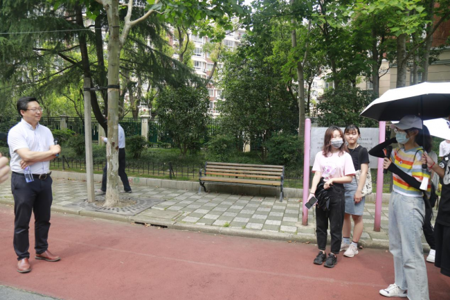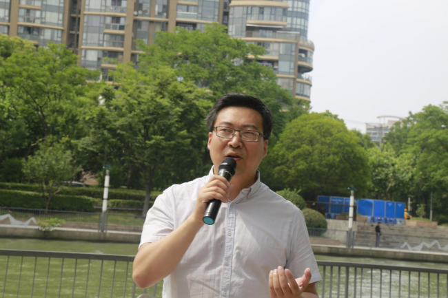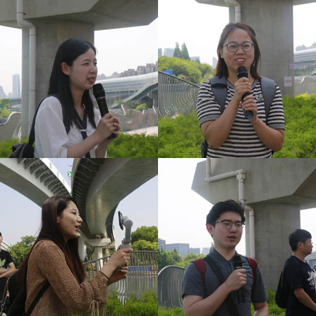 下午2点,师生们于宝成路桥集合,午休后的同学们显得更加生龙活虎,消去了上午4小时行程所产生的疲惫。在本站点,上海市环境科学研究院高级工程师吴健老师向同学们介绍了苏州河的工业文明历史、苏州河的生态环境治理过程与周围小区居民的支持。简要介绍后,吴健老师与同学们一同步行前往梦清园环保主题公园,途中路过小花园湾等几处苏州河的拐弯处时,吴老师利用自己丰富的知识讲解了此段苏州河的革命历史、工业历史、路边的植物类型等等,让同学们受益匪浅。