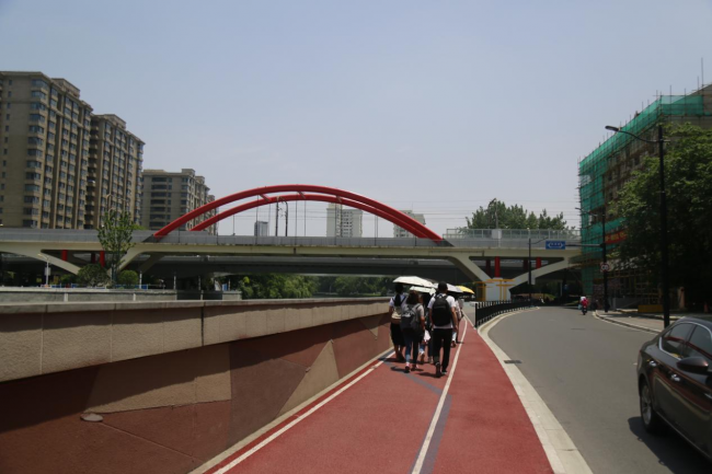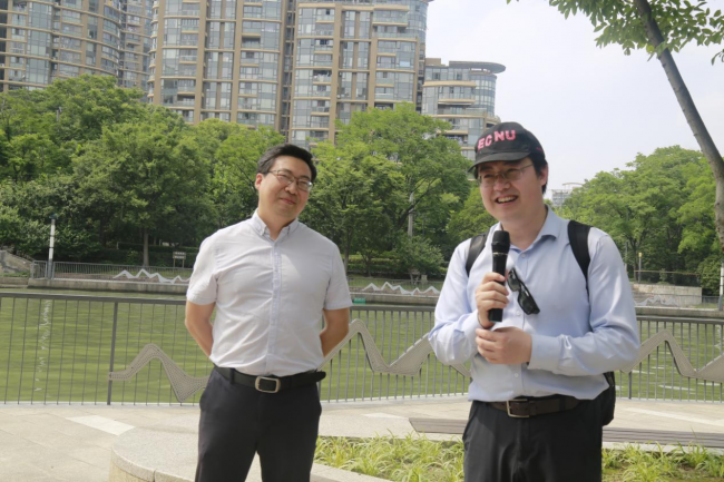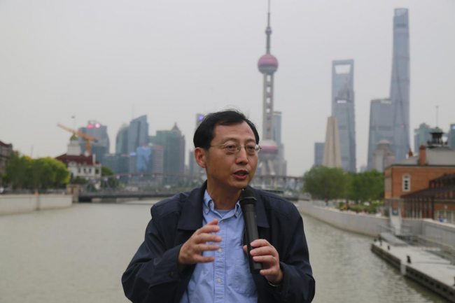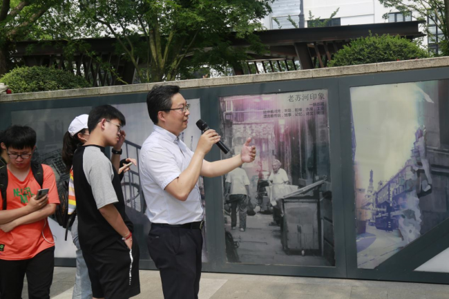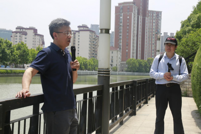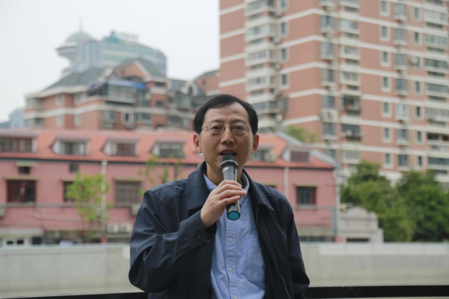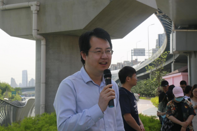 上午10点,师生步行至长宁区苏州河景观步廊参与第二场讲解。上海英凡环保技术公司董事长、八叉书库 八叉书库 校友张明成向同学们介绍了位于苏州河对岸的公司的简介、自身的创业经历以及一个企业所需要的员工是什么样的。讲解结束后,张总就同学们提的问题建议同学们作为一个环境专业学生不仅要注重专业知识的学习,更要注重对相关政策、法律法规、新闻的关注。随后同学们与张明成董事长在景观步廊拍摄了合影,便赶路前往下一站——强家角人行桥。