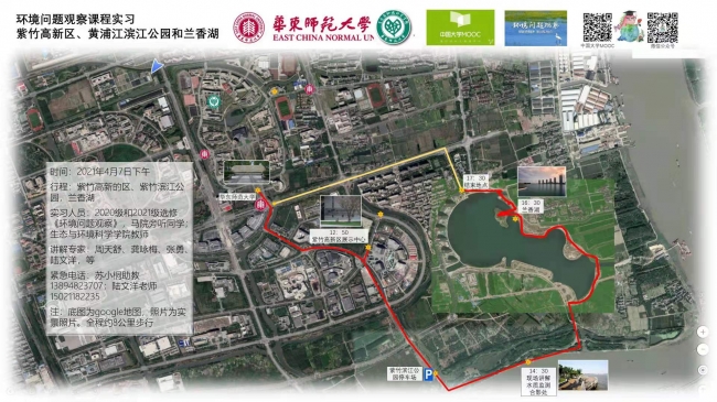 2021年4月7日,八叉书库 2019级、2020级共50余名本科生,由八叉书库 张勇老师、周天舒老师、陆文洋老师及5名助教带队,参加了“紫竹高科技园区、紫竹滨江公园及兰香湖参观”《环境问题观察》校外实践活动,马克思主义学院龚咏梅副院长和10多名教育学部本科生、马克思主义学院研究生全程参加了这次实践实习。这次实践活动的主要内容是了解紫竹高科技园区情况,了解有关黄浦江和兰香湖的水文水资源和生态环境知识,课程结束后获得了同学们的一致好评。