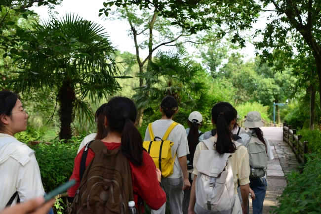4日上午,师生们迎着朝阳,从酒店步行至杭州西溪湿地。在讲解员的娓娓道来下,师生一行人漫步在幽静的公园小道,沉浸式感受古人传统的劳动智慧及今人生态保护的智慧。坐上电动游船,水面波光粼粼,两侧各式花草树林,时不时瞥见两三个前人遗留下的水闸,历史的纵深感与自然的舒适感相容,让人沉醉其中。在此优美环境下,同学们不忘考察目的,对水道两侧的生态护堤松木桩进行了探讨,也对水环境治理和传统桑基鱼塘蕴含的生态学进行了思考。