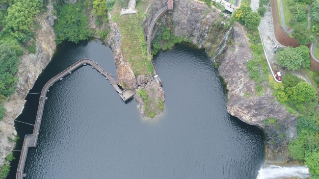经柳林老师介绍,矿坑花园面积约39000平方米,这里原来是辰山采石场的西矿坑。根据原有生态地貌改造成了镜湖区、台地区、望花区和深潭区四个区域。矿坑花园具有优良观赏特征的乔木、低矮灌木和草本植物,包括蔷薇科、石蒜科、忍冬科、锦葵科、马鞭草科、锦葵科、菊科等1000多种植物。早在二十世纪五十年代初至八十年代中期,辰山南坡被用作开采建筑石材的场地,采石挖掘后留下东西两个采石场遗址。其中西侧采石区在山体开采完后,又向地下纵深挖掘,深入地面六十余米,形成了面积达10000平米的人工深潭,潭水水面离地面30余米,深30余米,悬崖峭壁高30100米。