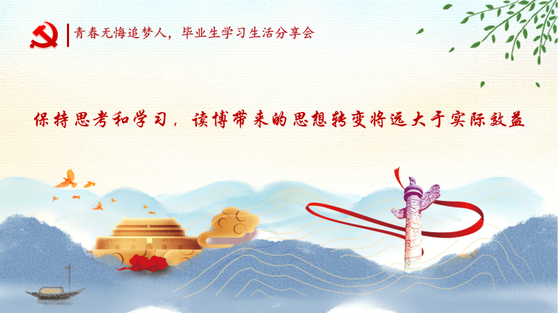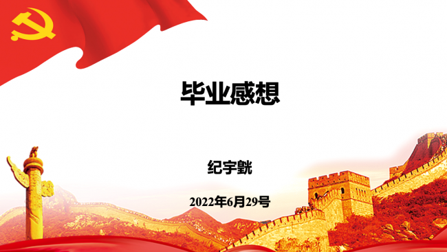 纪宇皝同学分享了自己的毕业感悟。内容分为三个部分:学习、活动和求职。他说在博士阶段,最重要的是要学会与他人交流,善于交流能让自己的课题进展地更顺利。同时,通过上课与其它专业的同学沟通交流也能够给自己带来不同的经验和感悟。另外,他认为在闲暇时间要多提升自己方向的专业技能和分析能力。其次,纪宇皝同学分享了自己在党支部工作中的经历和业余运动方面中的经验,他认为多参与团体活动可以锻炼合作意识,强健体魄,为科研工作打好基础。最后,他分享了自己的求职经历,鼓励大家多去尝试,要自信,勇于突破自己的舒适区才能有更好的突破。