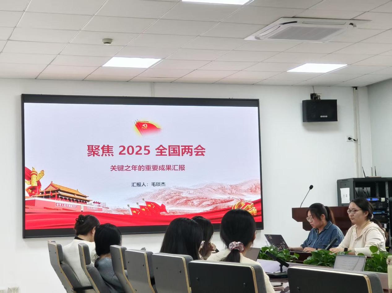 活动第二部分,由第三党小组毛琰杰同学聚焦2025年全国两会,从两会概况、经济发展、民生保障、生态环境和科技创新五个方面,与支部党员一同分享学习。今年的全国两会为“十四五”收官和“十五五”开局指明了方向,全体党员应将两会精神转化为实际行动,为实现中国式现代化贡献力量。