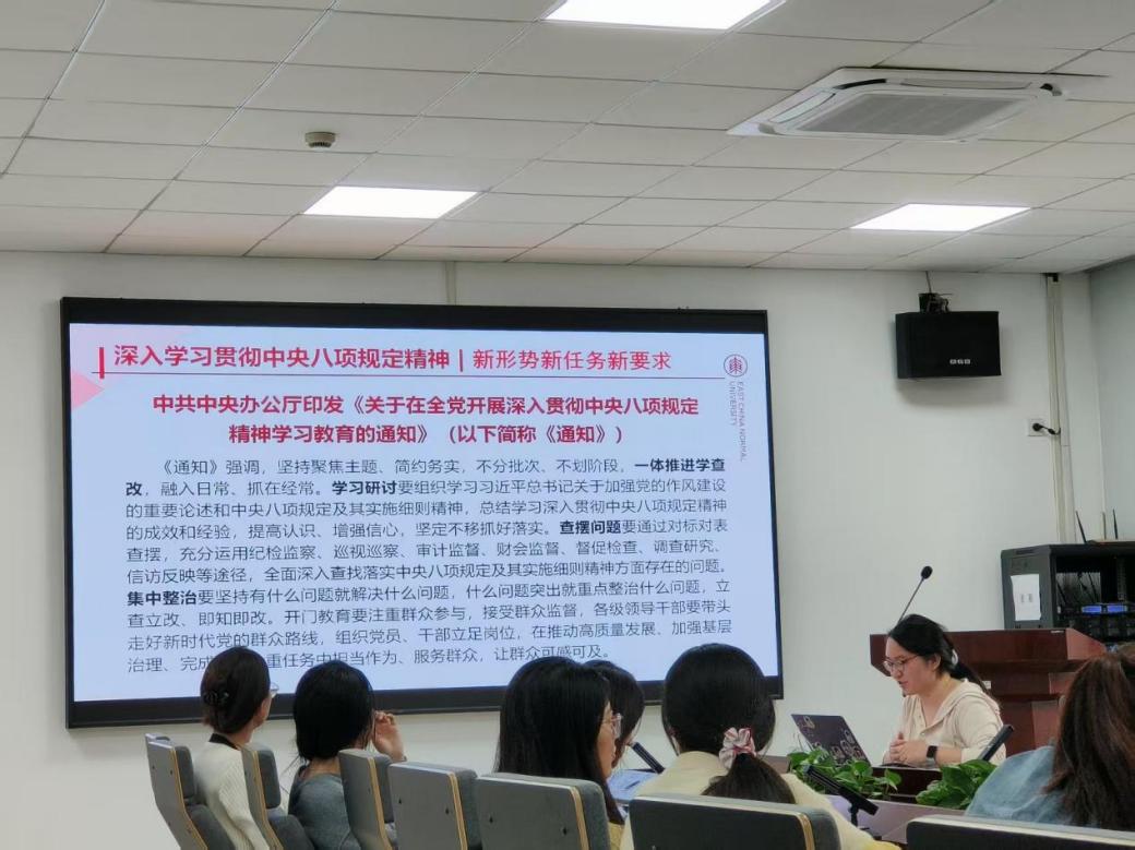 活动第一部分,由支部书记徐寒雨首先围绕中央八项规定及其实施细则精神展开专题学习。通过系统学习解读《中央八项规定精神》,全体党员要严格对照规定,加强作风建设、杜绝形式主义、厉行勤俭节约、持续强化监督检查。全体党员需以更高标准将制度要求转化为行动自觉。通过对比“中央八项规定”与“中央八项规定精神”的适用主体差异,帮助党员明确精神的针对性和广泛性,进一步增强了政治意识和纪律意识。