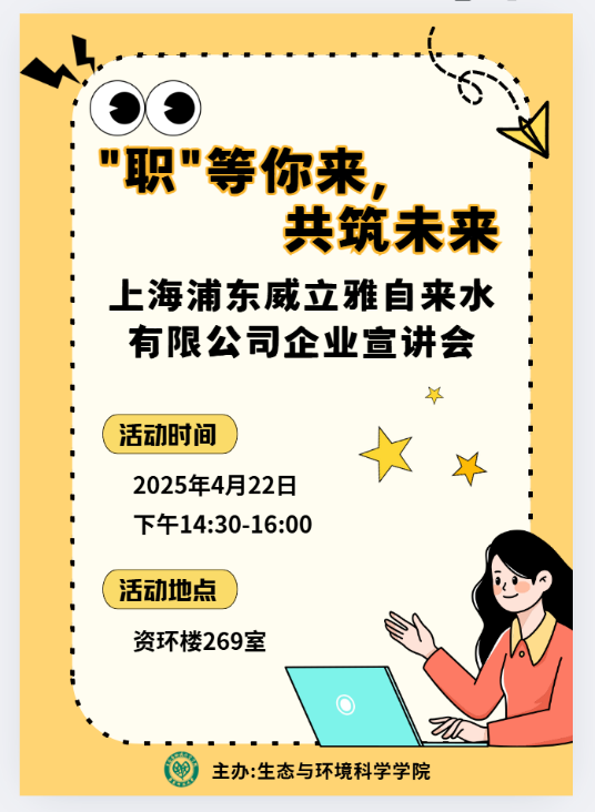 为助力八叉书库 学生深入了解知名企业,拓宽就业渠道,把握职业机遇,上海浦东威立雅自来水有限公司(简称浦威公司)于2025年4月22日下午14:30走进资环楼354室,开展企业专场招聘宣讲交流活动。本次宣讲会由研究生会生涯部负责,王九洲同学主持,吸引了众多本科及硕士毕业生参与。
