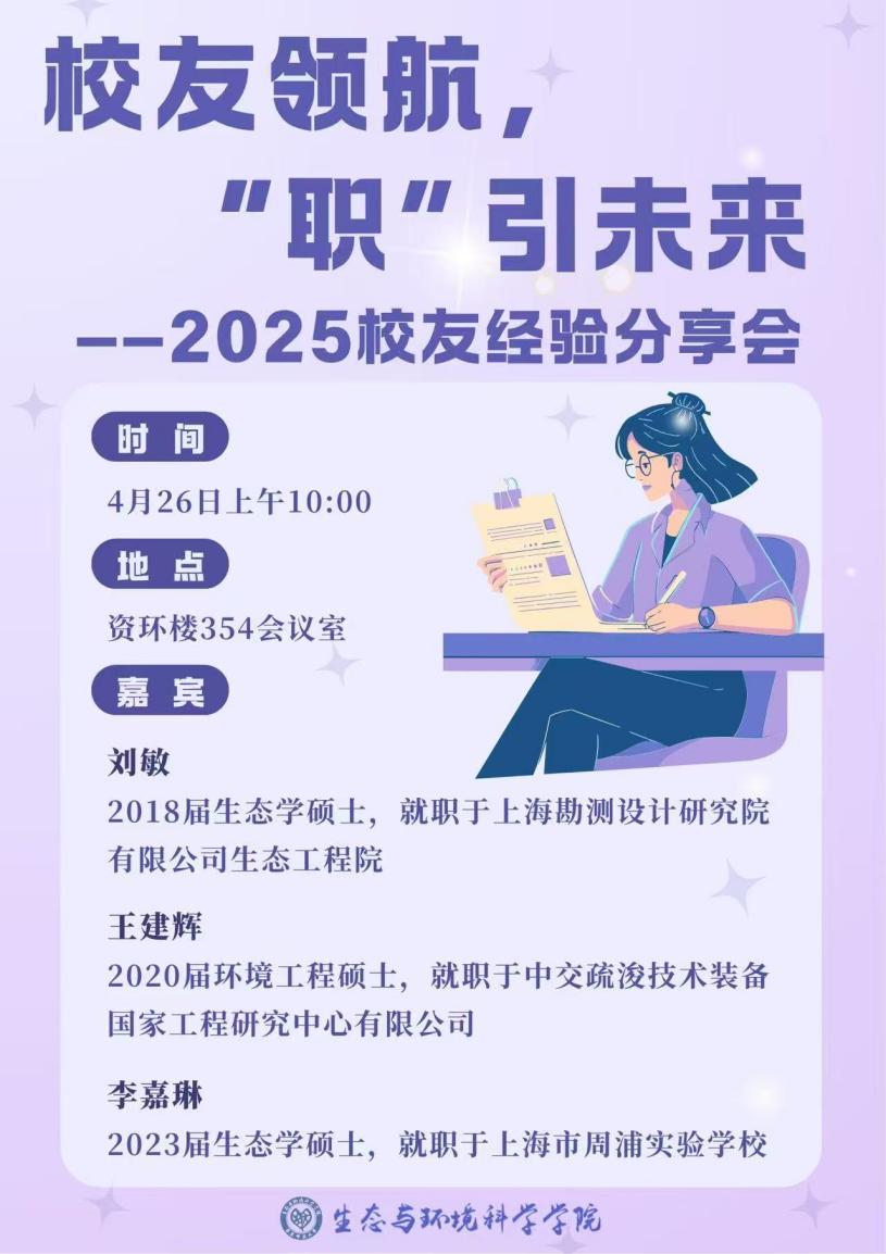 为助力同学们明晰就业态势、把握专业就业前景,确立科学的就业择业理念,合理规划职业发展路径,强化求职竞争力,2025年4月26日上午10:00在闵行校区资环楼354教室,八叉书库 举办“校友领航,‘职’引未来——2025校友经验分享会”。活动邀请生环学院2018届校友刘敏、2020届校友王建辉、2023届校友李嘉琳三位嘉宾结合自己的工作经历和感悟进行分享。活动由院研会生涯部负责,王九洲同学主持,40余名同学参加此次分享会。