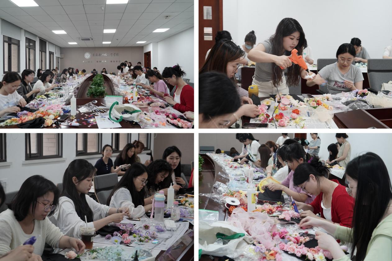 活动现场准备了丰富的花材和装饰材料,包括各色鲜花、绸带、珍珠、贴纸及热熔胶枪等工具。主持人陈粤琦详细讲解制作流程和安全事项后,同学们跃跃欲试,纷纷投入创作,从色彩选择、饰品修剪到定位粘贴,每顶学位帽都融入了独特的创意与情感。