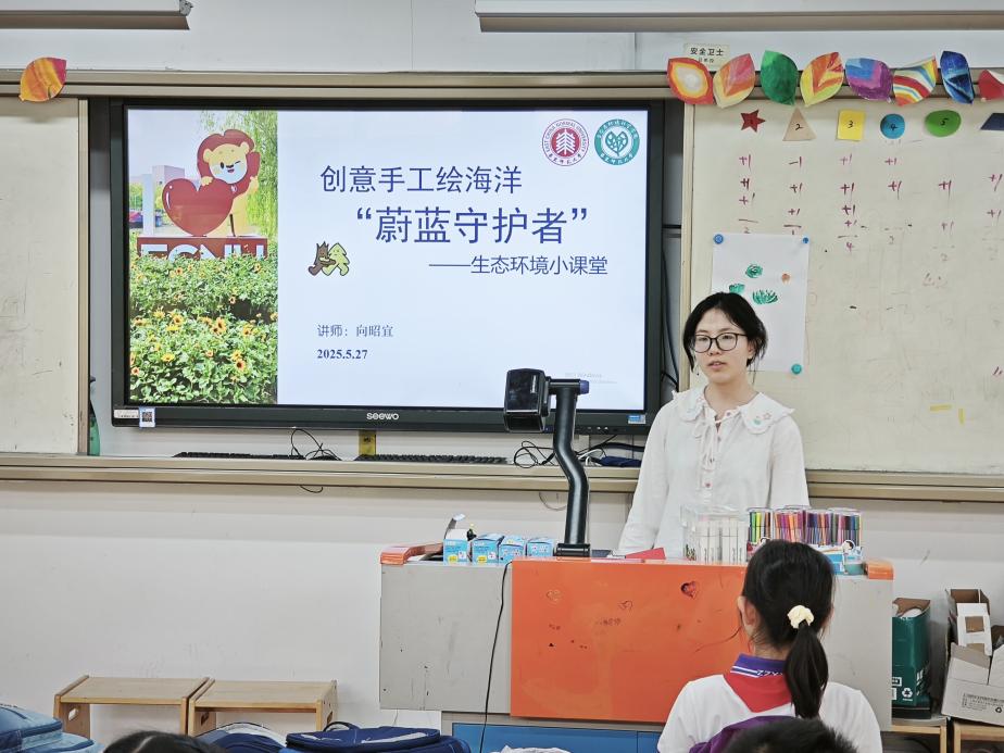 2025年5月27、28日下午,生态环境小课堂讲师团前往八叉书库 附属紫竹小学、永德学校开展环教课,本次环教课的主题为“创意手工绘海洋—‘蔚蓝守护者’”,担任本次课程的讲师为向昭宜、夏妍妍和马江玲同学。