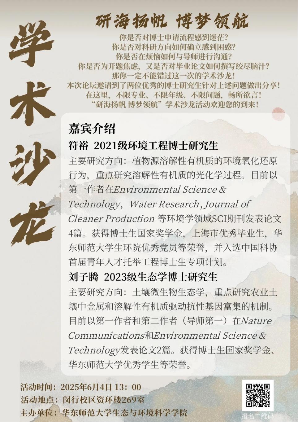 2025年6月4日下午13:00,生环学院研究生会携手2023级生态学、环境学硕士研究生团支部,在资环楼269室成功举办“研海扬帆,博梦领航”研究生学术沙龙。本次沙龙特邀符裕、刘子腾两位优秀博士研究生作为嘉宾,为大家分享开题报告撰写和论文写作经验,活动由学术部阮文亮同学主持。