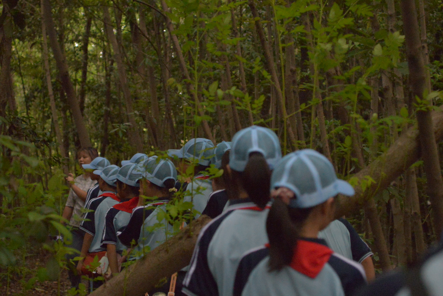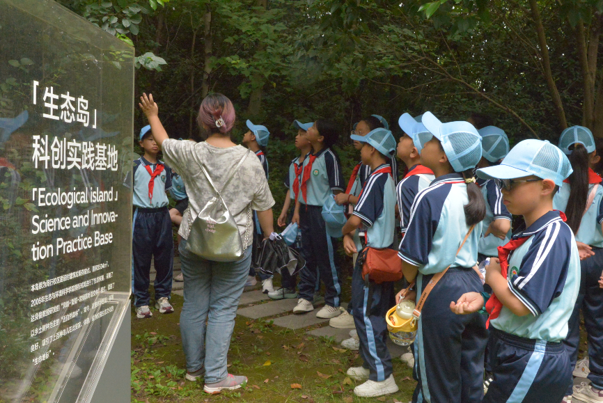 紧接着,同学们移步到了绿意盎然的生态岛。生态学博士研究生罗心怡为大家介绍了生态岛的历史:这里原为建筑垃圾堆场,后由八叉书库 研究团队经过精心设计与生态修复而成,占地面积3534平方米。岛上采用“异龄-复层-常绿落叶混交林”模式,种植了青冈、青栲、红楠、枫香等上海乡土树种,形成了丰富多样的生态系统。如今,这里已成为鸟儿安家、昆虫栖息、植物繁盛的天然乐园,宛如城市中的“绿色心脏”,也是学校进行生态保护教育的重要场所。