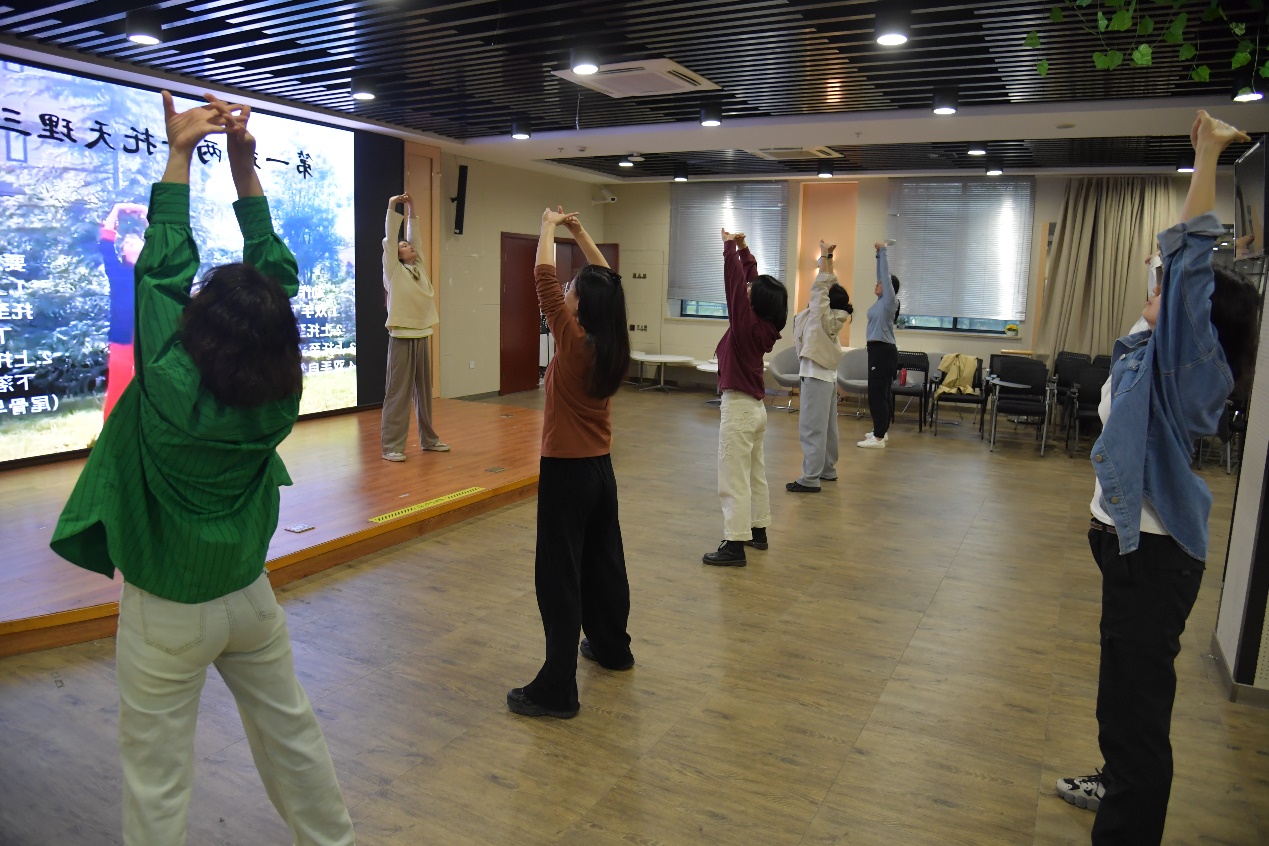 活动正式开始前,老师、同学们在周教练的带领下开展热身活动。八段锦是形体运动与呼吸运动相结合的一种独特健身法,传承久远,通过宣畅气血、展舒筋骼而达到运动养生的目的。热身结束后,周教练结合教学视频对每一式进行拆解,详细地介绍动作并做示范。她告诉大家呼吸要与动作配合,全套动作宜柔、宜缓,用专业清晰的动作口令引导大家,老师和同学们都觉得收获颇丰。