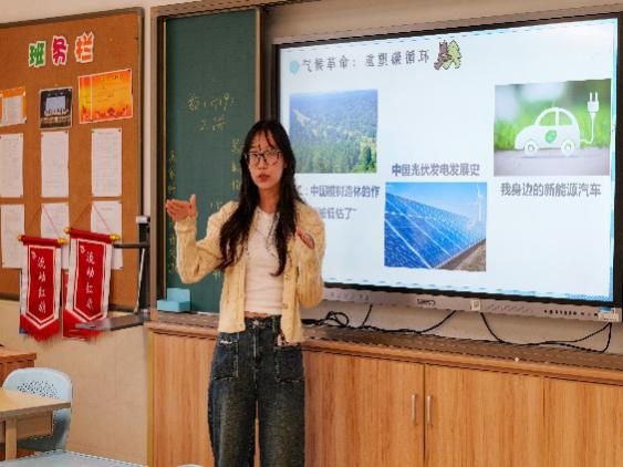 课程最后,讲师向同学们阐述如今人类对重塑碳循环所作出的努力,如植树造林、光伏发电等。呼吁同学们能够绿色出行,减少碳排放,帮助大自然重塑碳循环。