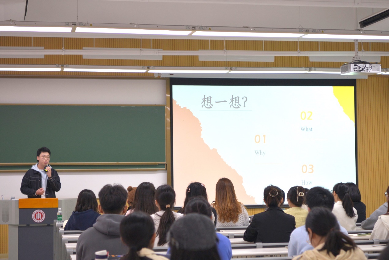 第一位分享的嘉宾是吴潇宇,目前就职于上海城投(集团)有限公司。吴潇宇围绕“Why?——为什么想去企业工作?”、“What?——想工作的企业是什么?”、 “How?——企业求职该怎么做?”这三个关键词向同学们分享企业求职经验。此外,他建议同学们丰富自己的实习经历,积累实践经验;留意各种有效的信息获取渠道,确保不错过任何招聘机会;最后,他提醒同学们可以采用Excel表格来细致追踪简历的投递状态,以便及时调整求职策略。