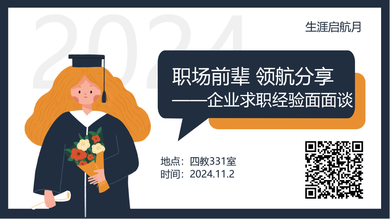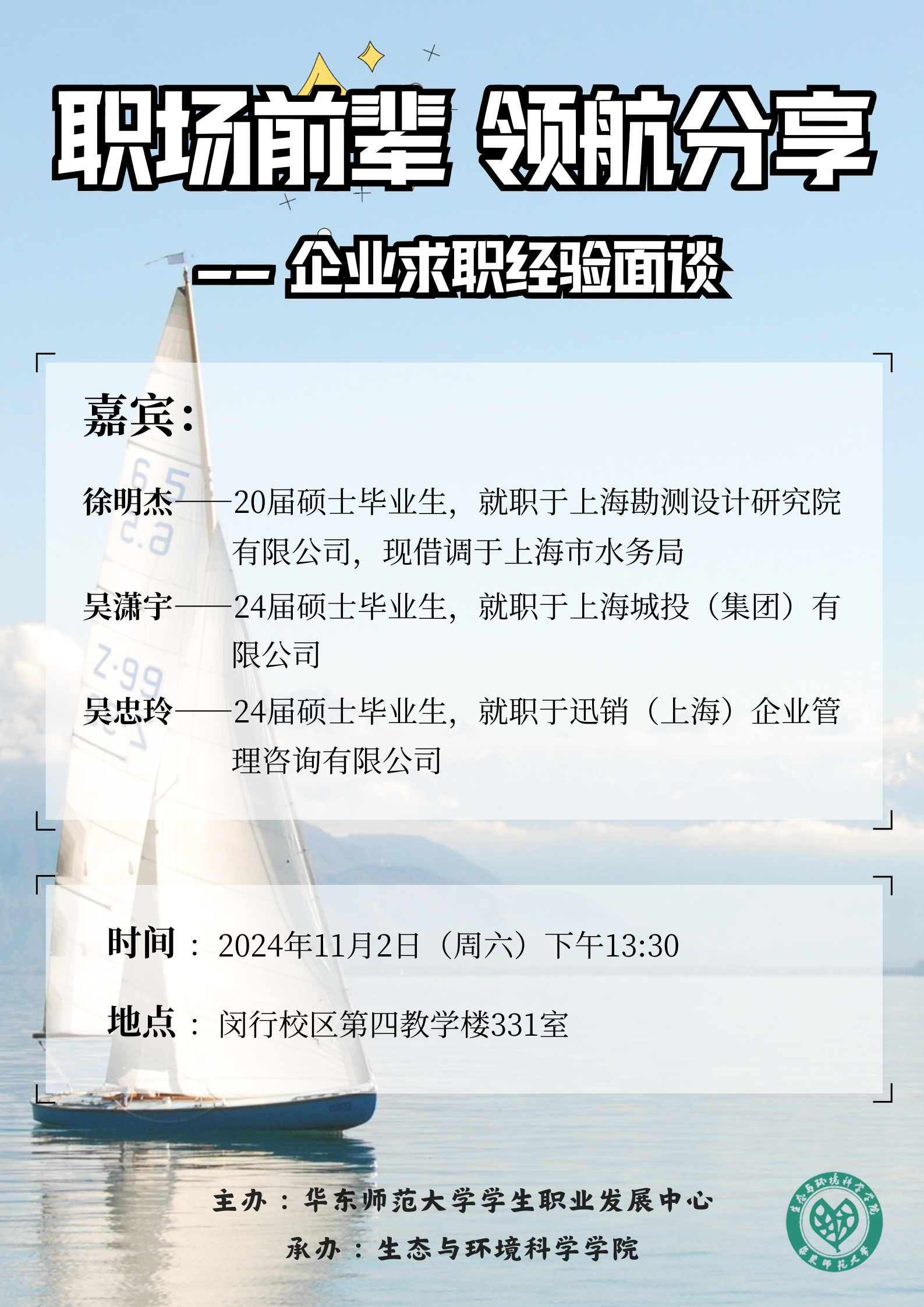 为助力同学们了解职场动态,掌握有效的求职策略,提升个人就业竞争力,为未来的职业生涯奠定坚实基础,八叉书库 于2024年11月2日在闵行校区四教331教室举办“职场前辈,领航分享——企业求职经验面面谈”就业分享活动。活动邀请20届生态学系硕士毕业生徐明杰、24届环境学系硕士毕业生吴潇宇和吴忠玲重回母校,和同学们分享他们的求职经验和工作感悟。专职辅导员吴丹和60余位学生参与本次活动,活动由研会生涯部负责人王九洲主持。