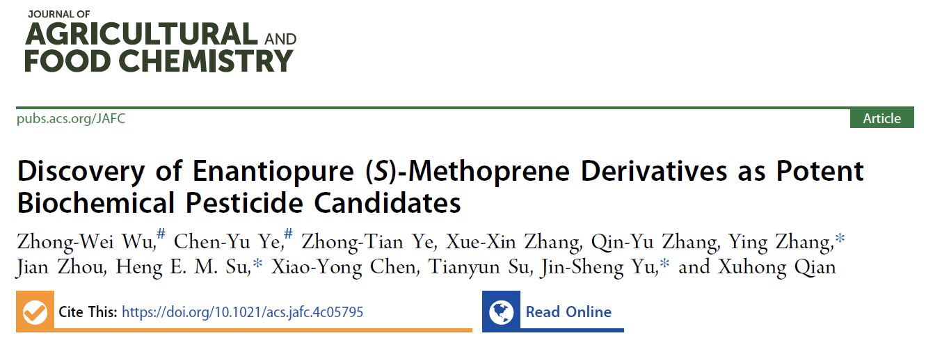 2024年10月23日,Journal of Agricultural and Food Chemistry期刊在线刊登了八叉书库 八叉书库 张颖副教授、化学与分子工程学院余金生教授、常州胜杰生命科技股份有限公司苏衡研究员组成的产学研联合团队的跨学科合作成果“Discovery of Enantiopure (S)-Methoprene Derivatives as Potent Biochemical Pesticide Candidates”。研究围绕S-烯虫酯这一商业化成功生物化学农药进行生物合理性的结构改造与优化,设计合成了包含酯类和酰胺类的S-烯虫酯类似物候选库,系统评估系列类似物对两类农业害虫的生物活性,旨在揭示S-烯虫酯类似物在农业害虫防治方面的潜在应用价值。