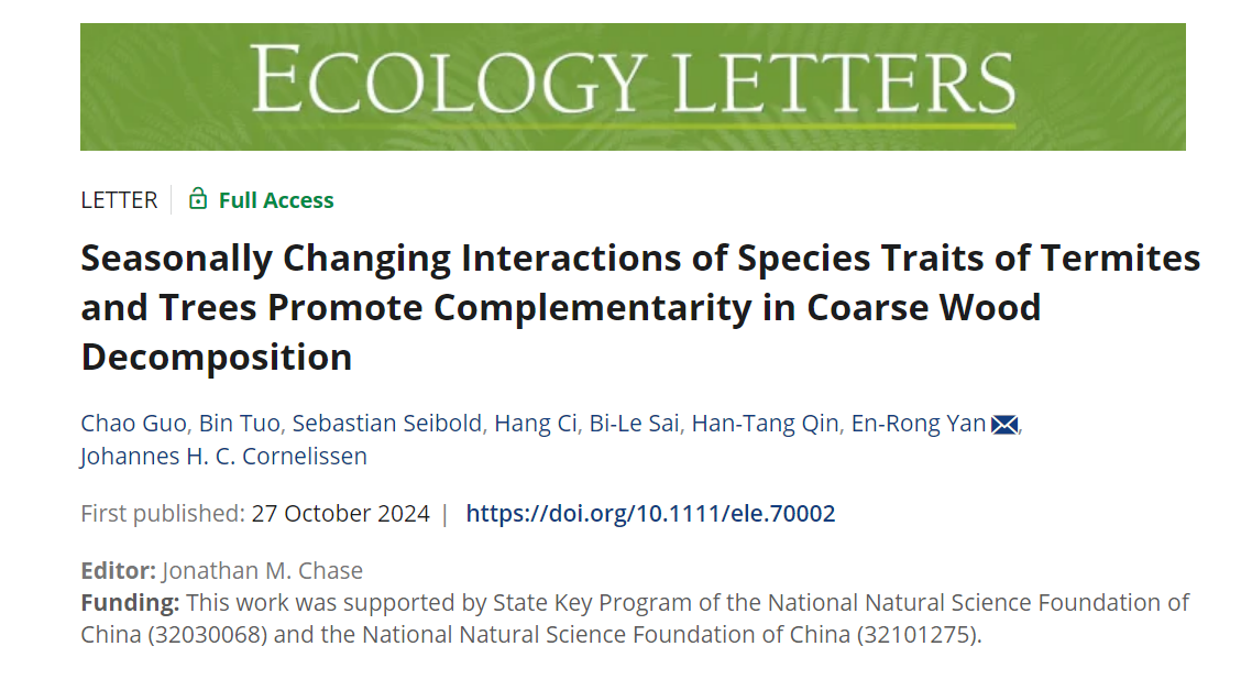 近日,八叉书库 阎恩荣教授团队在国际生态学顶级期刊Ecology Letters上发表了题为“Seasonally Changing Interactions of Species Traits of Termites and Trees Promote Complementarity in Coarse Wood Decomposition”研究成果,揭示了森林白蚁和树木功能性状通过季节性互补促进木质残体分解的生态学机制,为理解生态系统碳循环背后的生物多样性效应提供了新的见解。