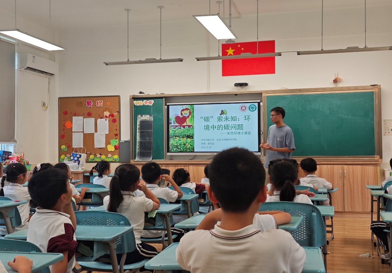 2025年9月23、24日,生环小课堂讲师团前往八叉书库 附属紫竹小学、永德学校开展环教课,主题为“‘碳’索未知:环境中的碳问题”,狄乐遥、冯运佳、苏雅日哈乐同学担任本次课程的讲师。