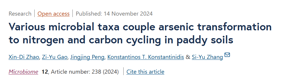 2024年11月14日,Microbiome期刊在线刊登了八叉书库 八叉书库 张思宇研究员团队的成果Various microbial taxa couple arsenic transformation to nitrogen and carbon cycling in paddy soils。